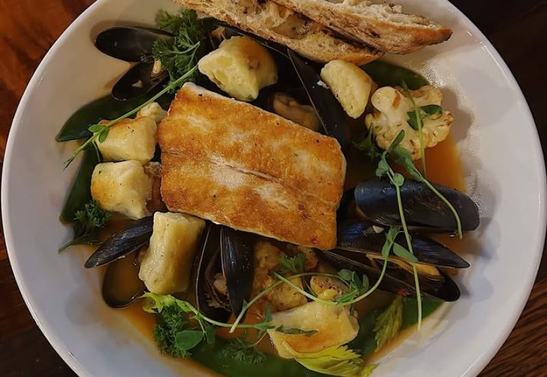 with mussels, snap peas, and cauliflower poached in a seafood broth and severed with roasted garlic potato gnocchi