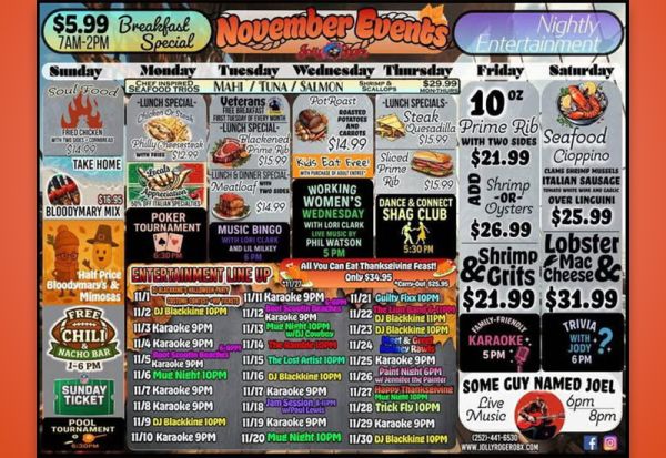 November Events at Jolly Roger 🏴☠️ Restaurant & Bar in Kill Devil Hills. Open seven days a week, year round. Yes!