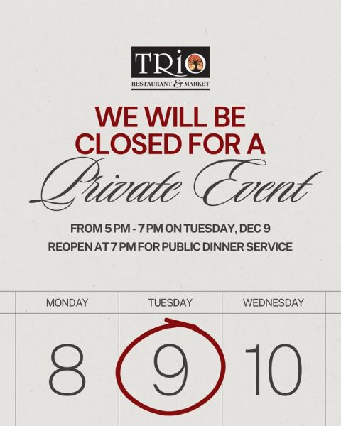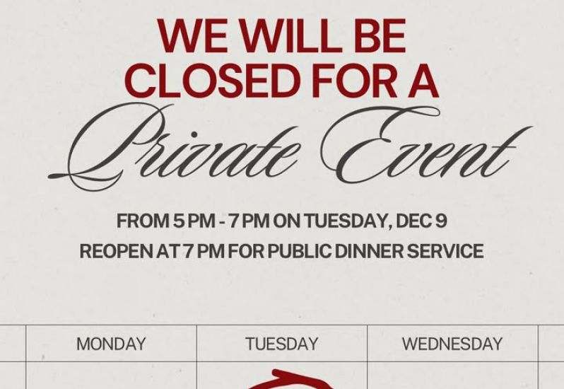 Heads up! We’ve got a private event this Tuesday, December 9th, from 5-7pm. We will be closed during that time but will reopen for public dinner service at 7pm!