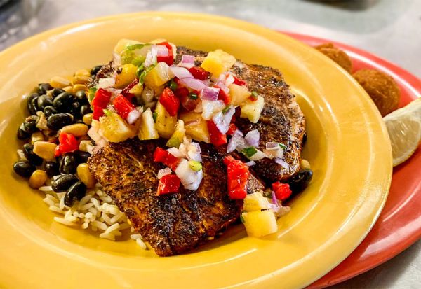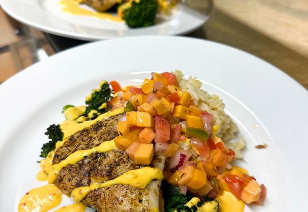 Come by for this delicious dish! 🍽️ Lemon Basil Seared Snapper with Primavera rice, braised broccolini topped with fresh fruit salsa and mango coulis drizzle!