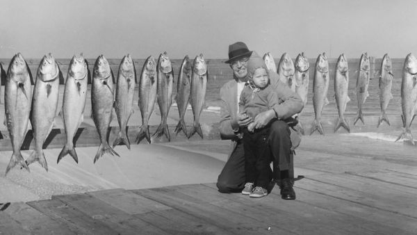 TBT -- Sunny and nice out but cold. No fish yet. Ocean temp 55 degrees, air temp 41 degrees. High tides 6:09 a.m. and 6:33 p.m. Low tide 12:49 p.m. West winds at 3 knots and clean small surf. A gentleman and perhaps his grandson pose for photo with a big catch of big BLUES.