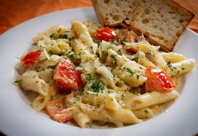 🍝 Penne Pasta with Italian Sausage, Fresh Tomatoes and a Cream of Parmesan and Romano Cheese Sauce.