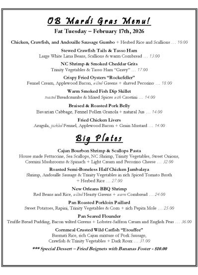 Hello everyone, today is Fat Tuesday! We love hosting this annual party and have a great menu planned for you! Party starts at 5pm, and this is a preview of what will be available for you. We expect only minor changes, if any, while we prepare the dishes. See you soon!