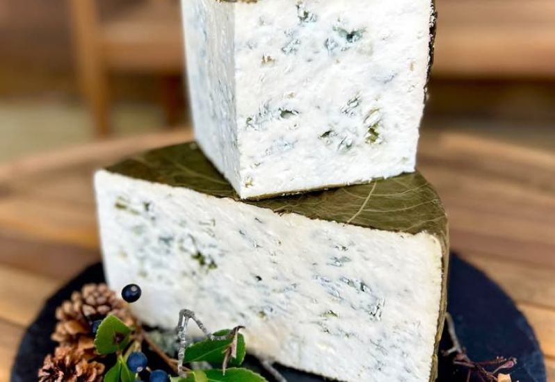 This beautiful blue would look perfect at your holiday party! Shakerag Blue is wrapped in local fig leaves that have been bathed in Chattanooga whiskey. This salty, boozy stunner has flavors of buttermilk, funk, fermented cream, pine, and grass.