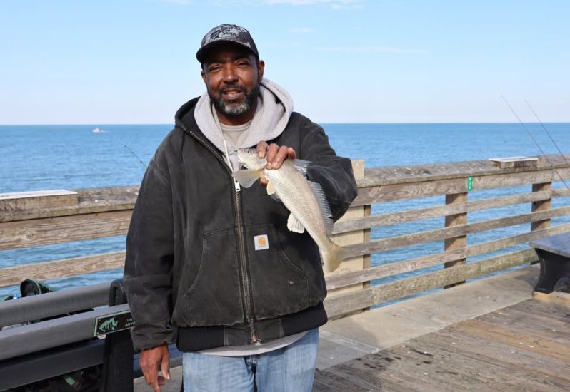 No fish to report yet. #Cloudy with little wind. #Ocean temp 60 degrees, air temp 54. East winds at 3 knots. High #tides 7:35 a.m. and 7:53 p.m. Low tide 2:05 p.m. Al Tillman of Durham holds up a nice, large sea #mullet he landed Wednesday afternoon.