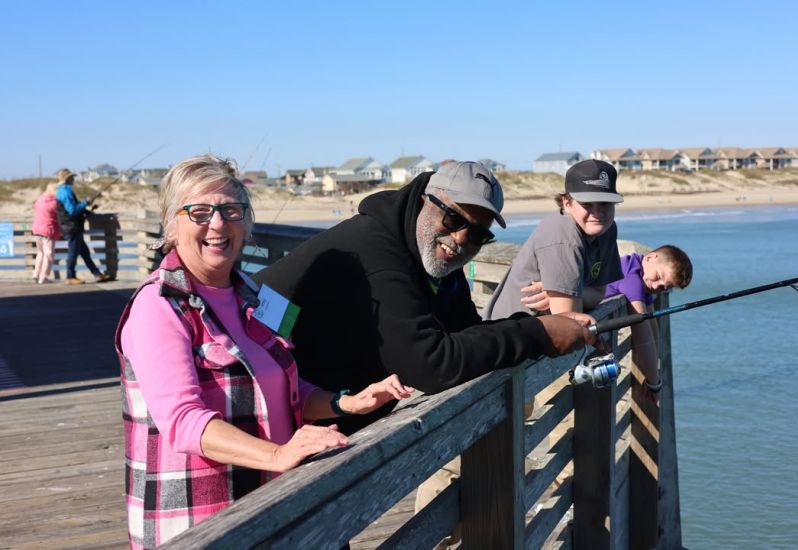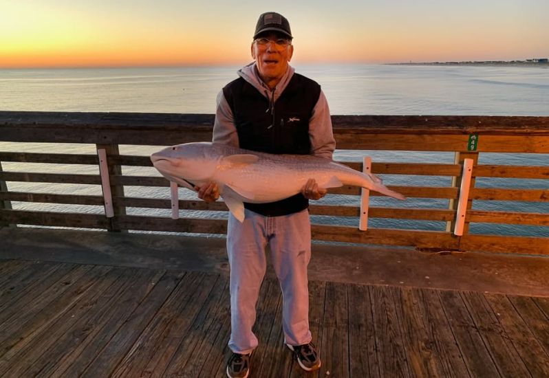 VIP Tourney Today! Rick Probst, pictured, caught and released this beautiful 42-inch RED DRUM at daybreak. Anglers are also catching small SPECKLED TROUT, BLUEFISH, FLOUNDER and SEA MULLET. Water temp 65 and winds are SW at 5 to 10 mph. High tide 7:57 a.m. and 8:08 p.m. Low 2:22 p.m.