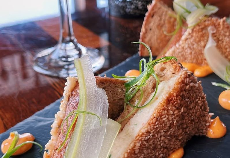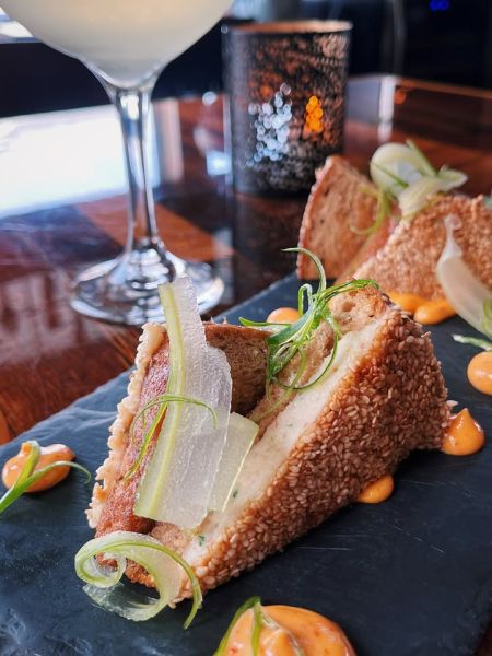 Today’s special is our current obsession: sesame-crusted shrimp toast with kimchi mayo and green onions