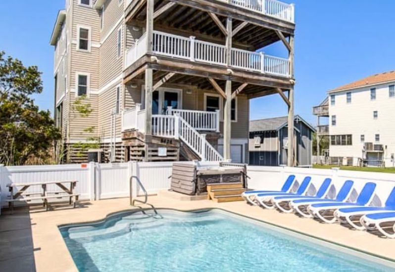 Just For Fun is a 5 bedroom, semi-oceanfront, dog-friendly home in South Nags Head that offers a heated private pool, elevator, hot tub, pool table, and more. Guests noted that the home well designed for large families, it was very clean, and the walk to the beach was easy and convenient!✨