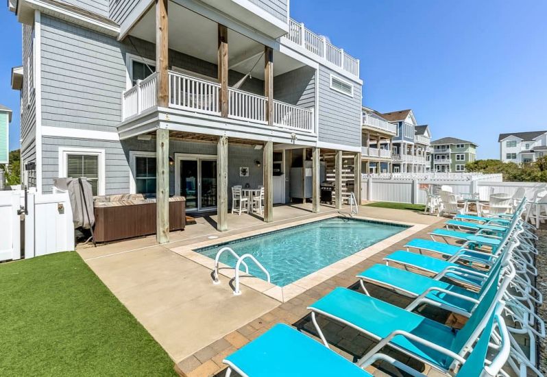 Hono-Lou-Lou is a 5 bedroom, oceanside home in Corolla that offers a heated private pool, beach gear credit, a 4 minute walk to the beach, hot tub, and more. Past guests noted that the house was well equipped and designed for family vacations with a close walk to the beach, the heated pool, games, a large driveway, and well-stocked kitchen!⭐️